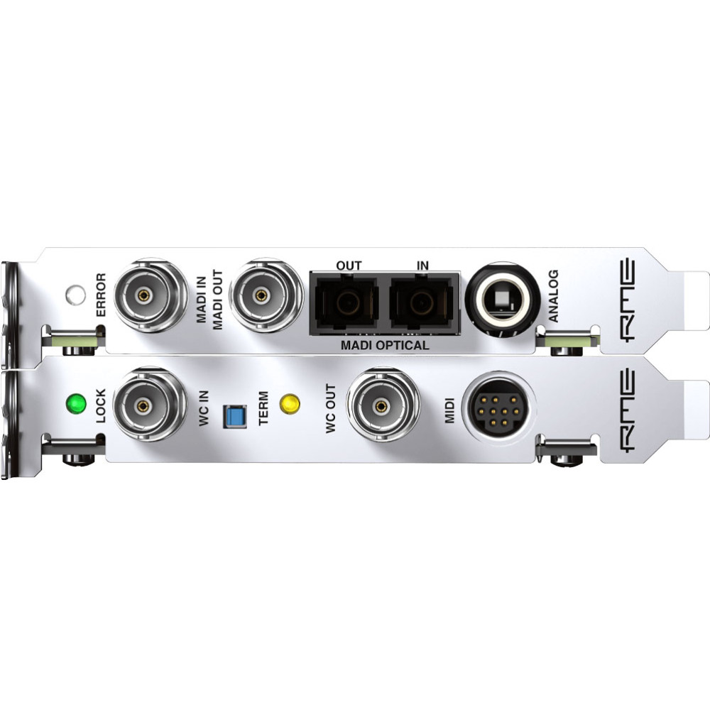 The included expansion board carries word clock I/O (BNC) and MIDI I/O. The word clock input is galvanically isolated via transformer and operates on both single and double speed signals automatically. MIDI I/O offers two completely independent MIDI inputs and outputs via breakout cable (4 DIN sockets). A virtual MIDI port allows for a direct transmission of MIDI data over MADI.
