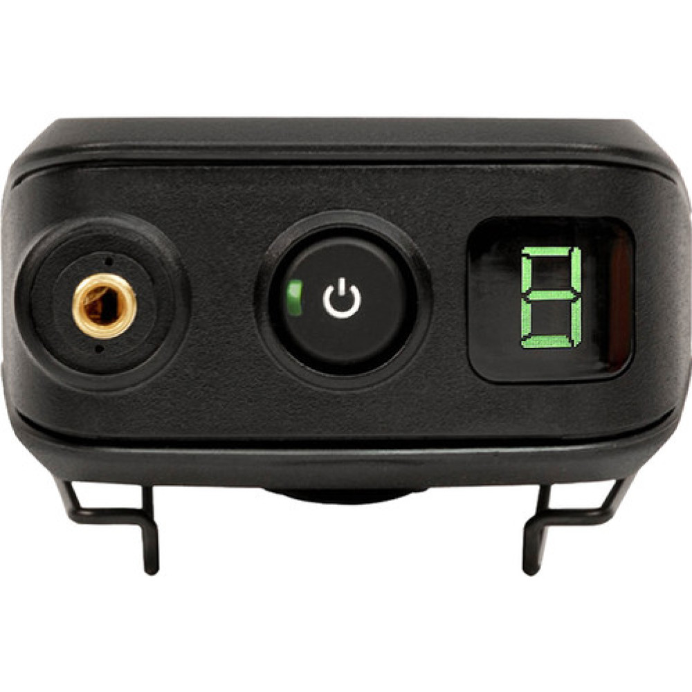 An internal antenna contributes to the compactness of the TX-BELT. It can be attached to a belt, strap, or clothing via the belt clip. The bottom panel slides down for access to the gain switch, which has positions for 0 dB, +10 dB, and +20 dB. Current channel selection is indicated on a large display by the dedicated power button. The 3.5mm TRS input features a locking jack socket to prevent accidental disconnection. The TX-BELT ships with a lavalier microphone and a captive TRS cable.